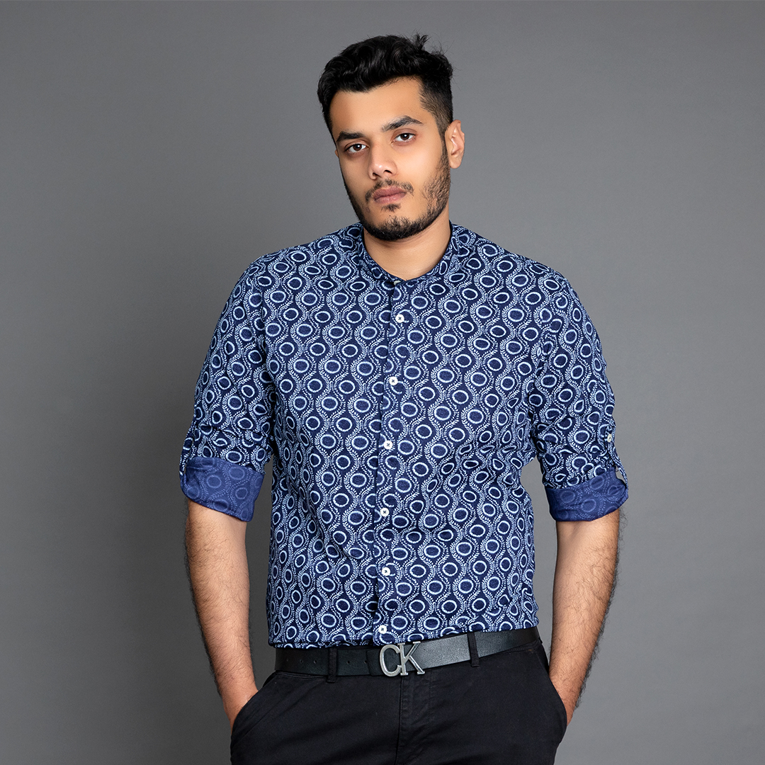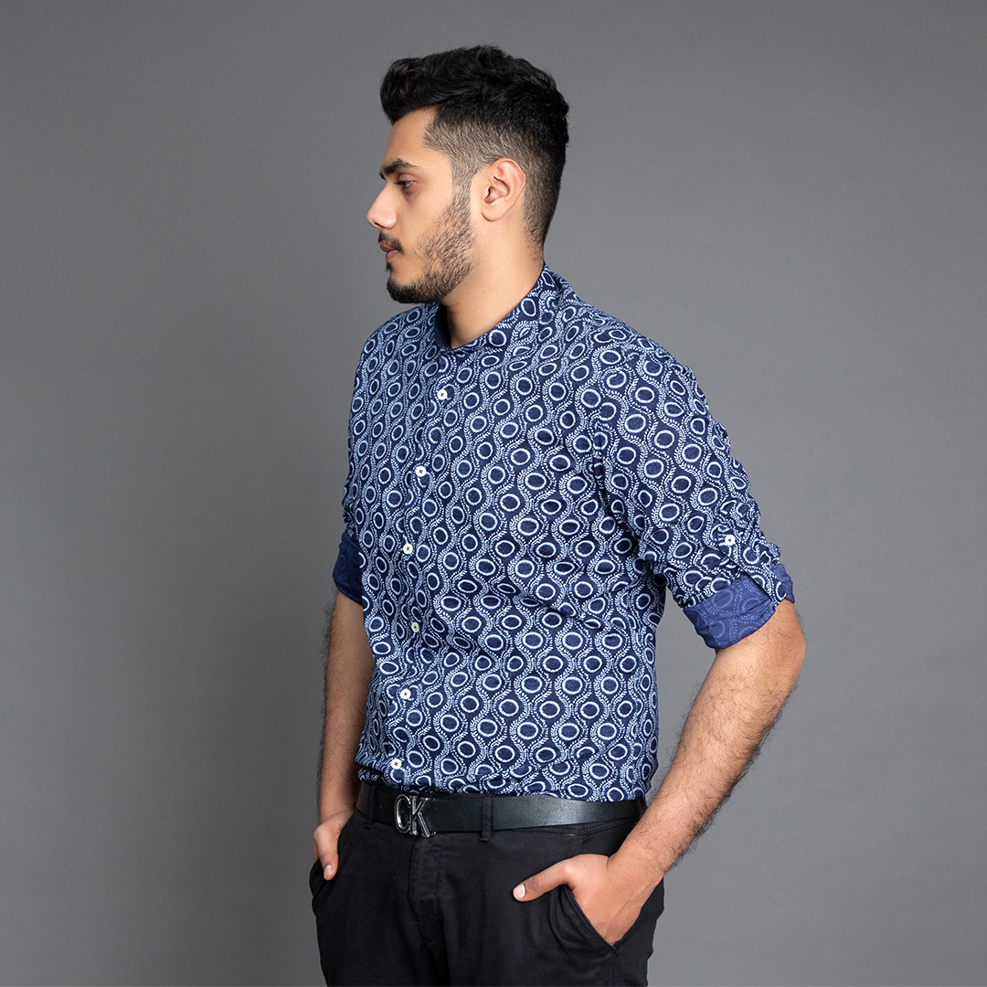 Outfit Printed Navy Blue Casual Cotton Men Shirt